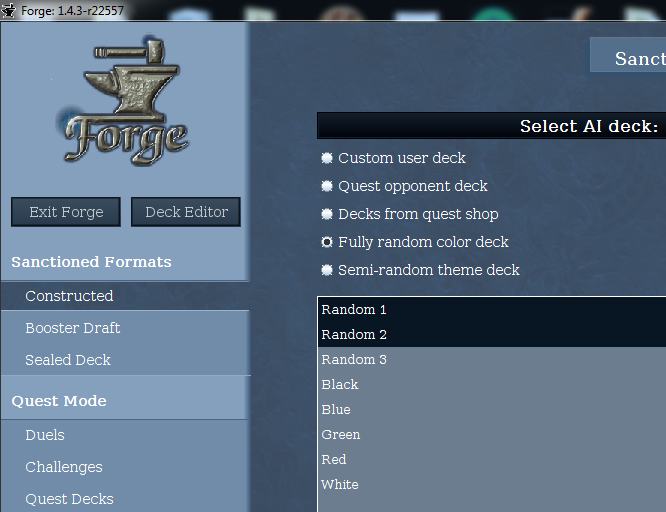 I just started up development of a Card/Set Editor (http://svn.slightlymagic.net/forge/bran ... dSetEditor). I realized adding a Card/Set Editor button to the Home Screen wouldn't look good with the way the Exit Forge and Deck Editor buttons were currently laid out, so I decided to reorganize the Home Screen menu panel to accommodate it. The Deck Editor, Card/Set Editor, and Exist Forge buttons are now in a column below the logo, and I increased the size of the logo and decreased the width of the panel to get rid of all the extra horizontal whitespace. To get back some of the lost vertical space, I went ahead and removed the extra padding above each format group. See below for before and after screenshots and let me know what you think. I'm certainly open to suggestions.