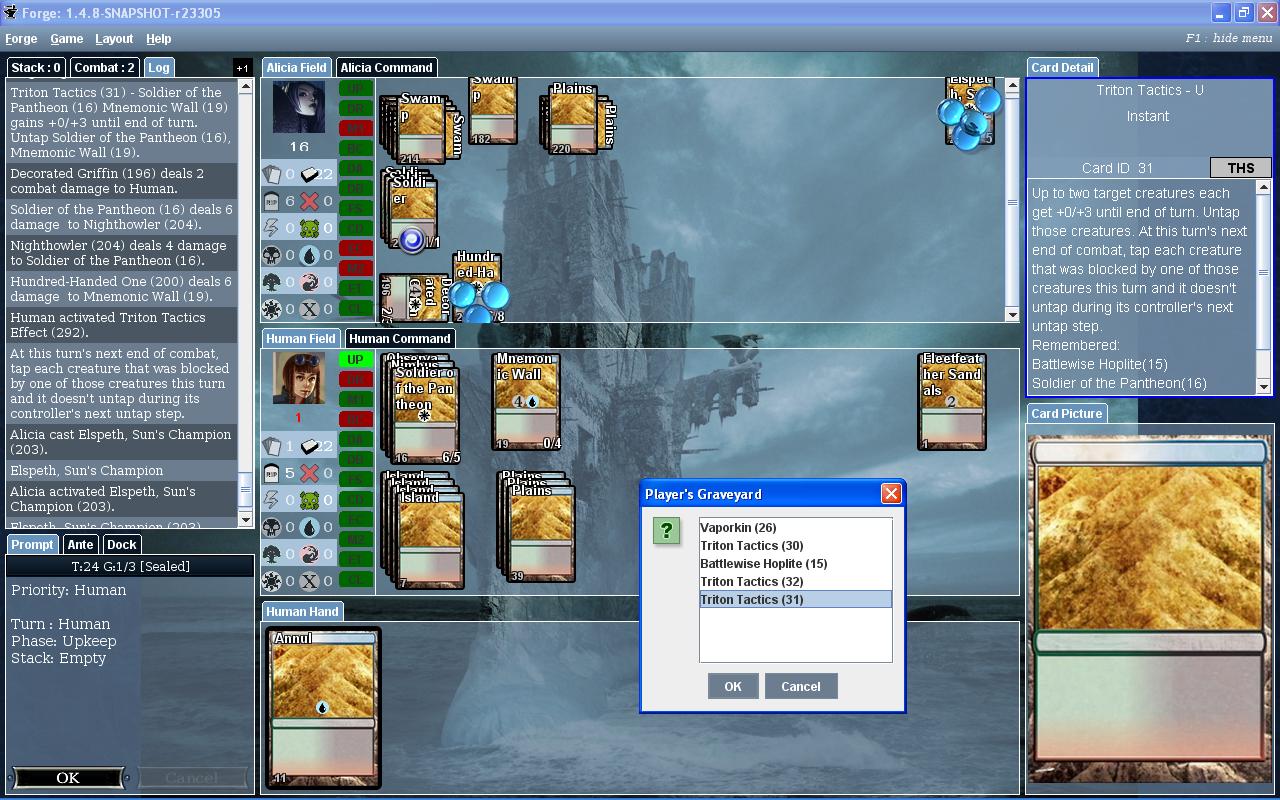 Looking at the log it lists the same creature attacking twice, so it must have been placed into two different attacking bands somehow. And according to your Combat pane, there are two different attacking bands as well, even though your screenshot only shows one creature attacking. Do you know if you did anything in particular to get it to attack twice? Can you post which version you downloaded that has Theros in it?Haytrid wrote:I am pretty sure this wasn't supposed to happen: