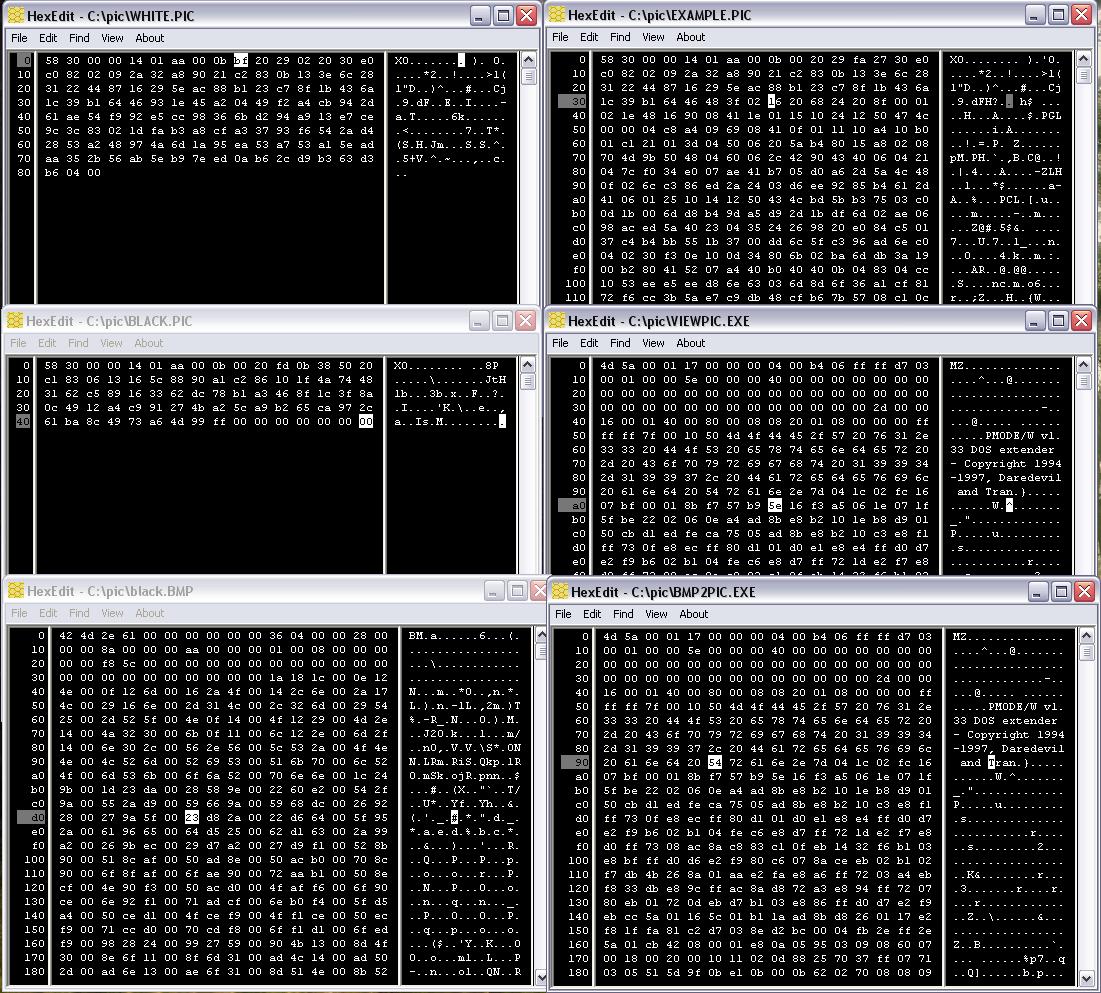 I used a hex editor to open the hex files and came out with some interesting results. I used bmp2pic to create .PIC files of an all black and all white .BMP file and used a hex editor to open them.