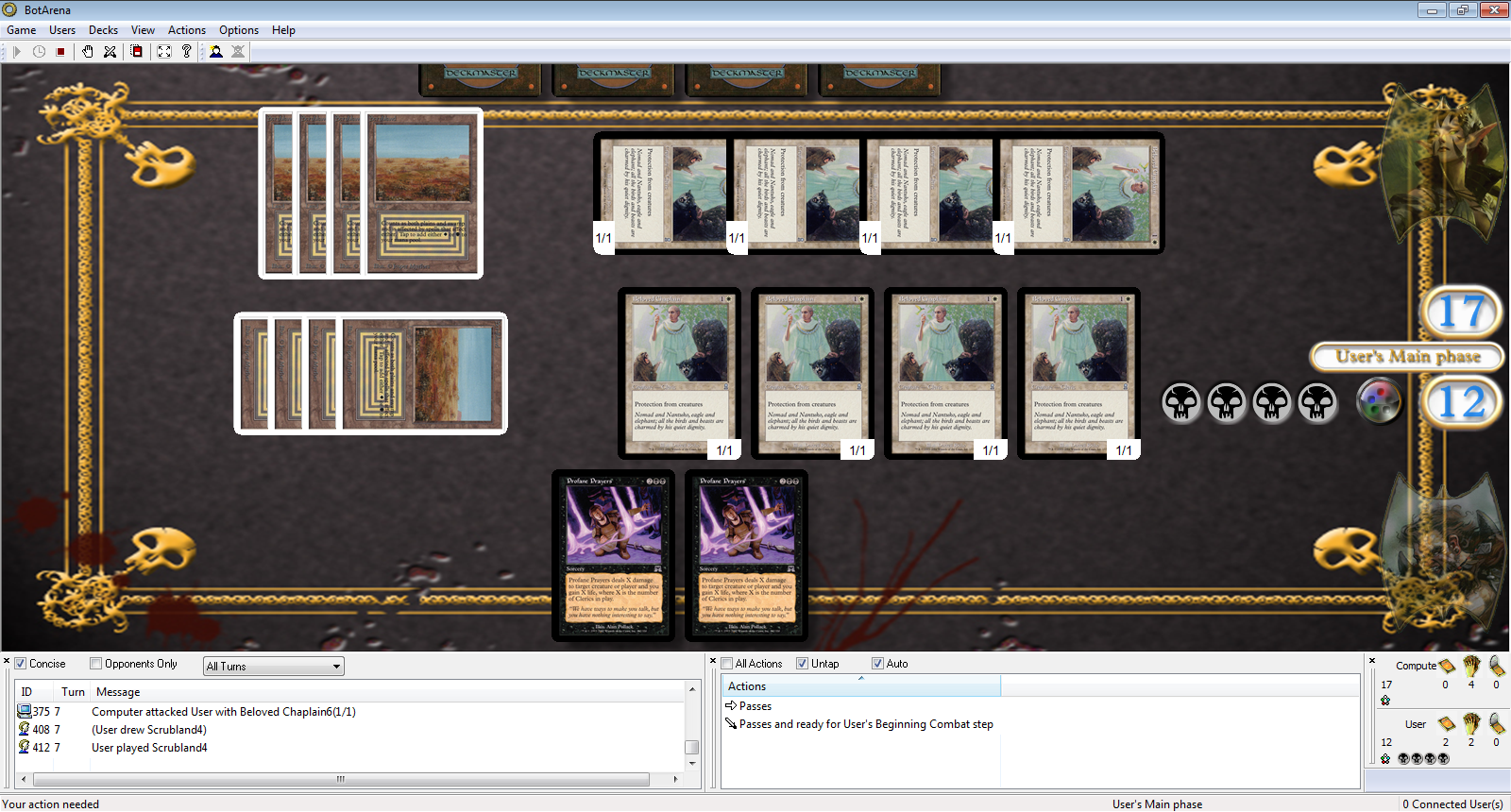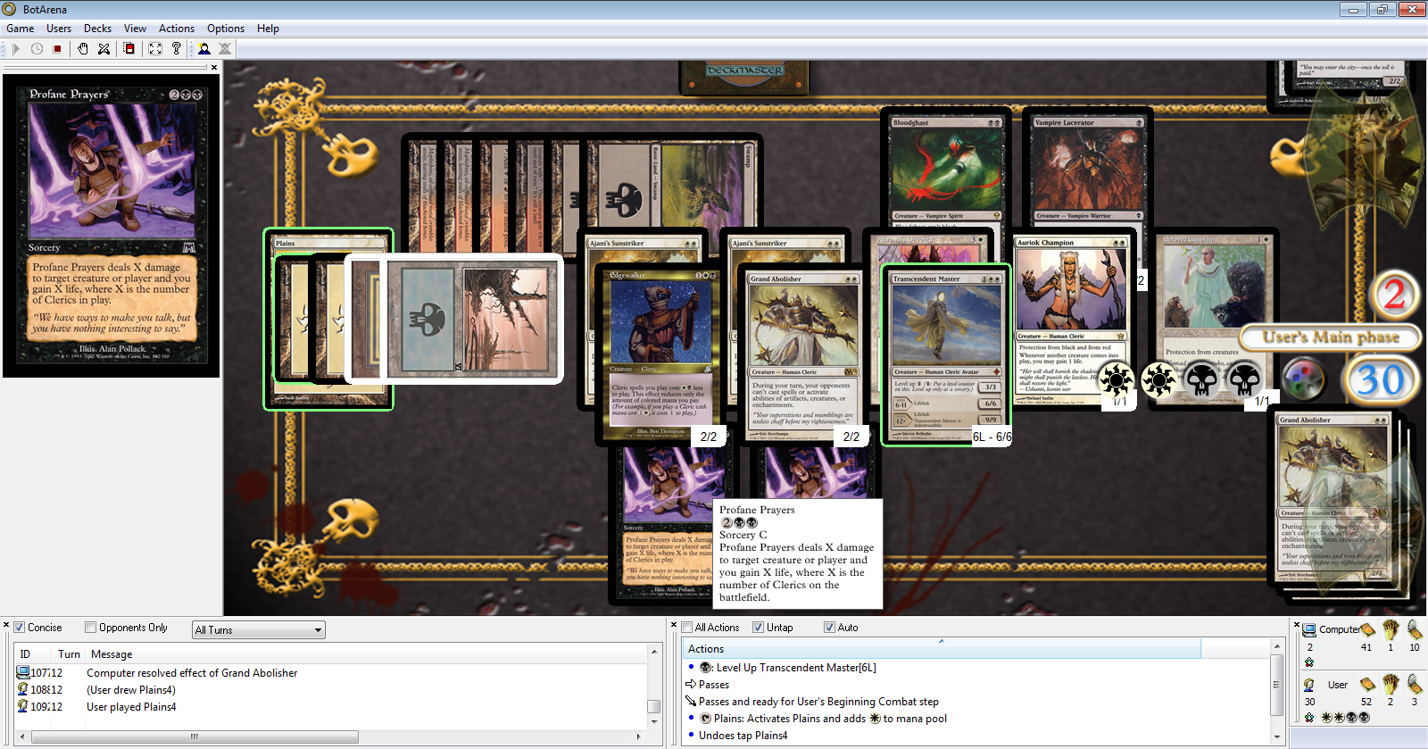 I am unable to play Profane Prayers during my main phase, regardless of how much mana is in my mana pool. At first I though it might be a bug with Grand Abolisher, preventing me from casting spells. Testing without Grand Abolisher in play (or even the deck) shows that isn't the case. I'm running BotArena 1.46.1 revision 369