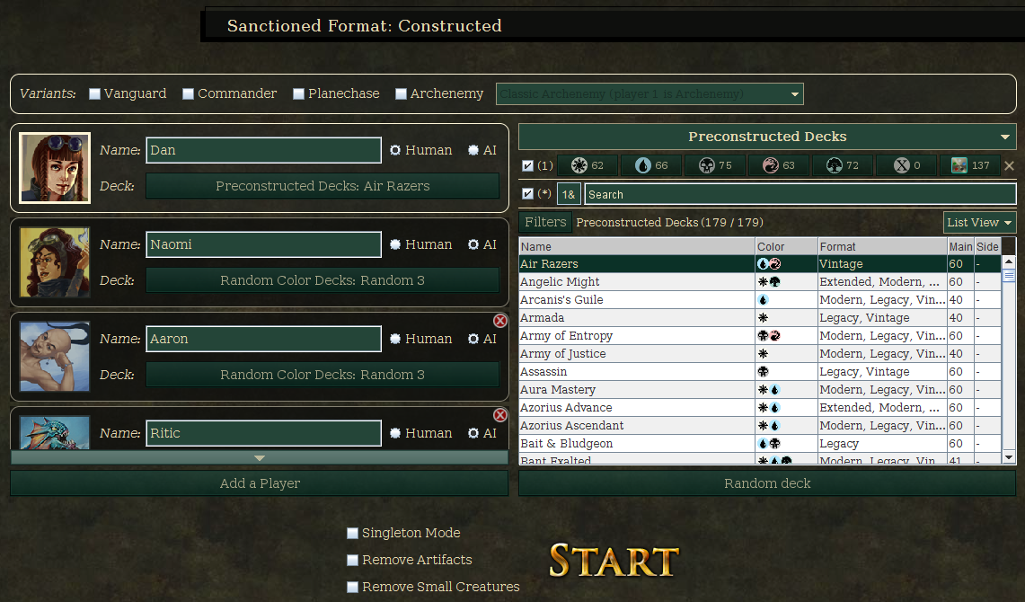 Thought I'd let you know that a much improved Constructed screen is coming with next release. Here's a taste of what it will look like:Marek14 wrote:Playing a random game requires a bit too many clicks with new layout. I suggest changing the "Random deck" button behaviour - to make it into a checkbox that will always select a random deck before the game. At the beginning of the game, the players would be informed about the selected decks.