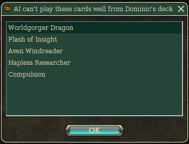 edit: Also, it looks like the message has been shortened to "AI can't play well these cards" to fit the line. If I remember right, that was the first part of the message explaining why the AI won't play flagged cards at all. Something like "Cards unusable by AI opponent" might be a little more accurate.