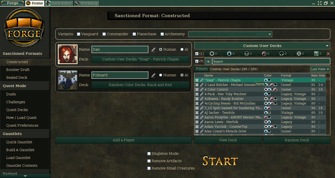 Great work. Did a quick test and everything seems to work as before with one exception. When Vanguard is enabled, switching the player type should update thhe avatar list immediately because some avatars are filtered out for the AI. Thanks to you and Dan both for helping realise this new match setup.Max mtg wrote:Thanks for your trust, yet I am not a master, just a professional programmer.