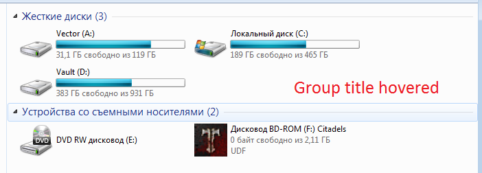Any point on the group title bar is clickable in windows explorer to expand/collapse its group