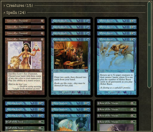 A Windows user confirms that without horizontal scrollbar more expensive createures are not visible. %)Agetian wrote:Ok, Linux user here.Not sure if it's just me missing or not understanding something, but I don't see horizontal scrollbars or arrows on my system, so if I have, for instance, creatures with CMC 1,2,3,4 that are currently displayed on the screen, if I add one more creature with CMC 5 I will not be able to see it because I can't scroll to it in any viable fashion... is it just me or is something not implemented yet?