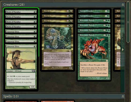 A Windows user confirms that without horizontal scrollbar more expensive createures are not visible. %)Agetian wrote:Ok, Linux user here.Not sure if it's just me missing or not understanding something, but I don't see horizontal scrollbars or arrows on my system, so if I have, for instance, creatures with CMC 1,2,3,4 that are currently displayed on the screen, if I add one more creature with CMC 5 I will not be able to see it because I can't scroll to it in any viable fashion... is it just me or is something not implemented yet?