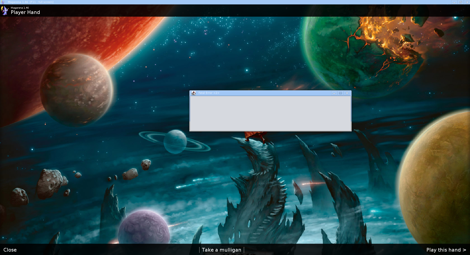 After hanging I quit to main Menu and try to new duel and Magarena reporting about Fatal Error 2 after mulligan.