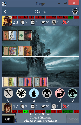 As you can see, instead of having 6 mana icons always visible, a single icon is present in each player's tab row which displays the total mana count in that player's pool, and then if you select that tab, it displays 6 larger clickable mana icons and counts for each individual color (and colorless). Tapping on these icons will allow paying mana costs when an InputPayMana is active, the same as in desktop Forge.