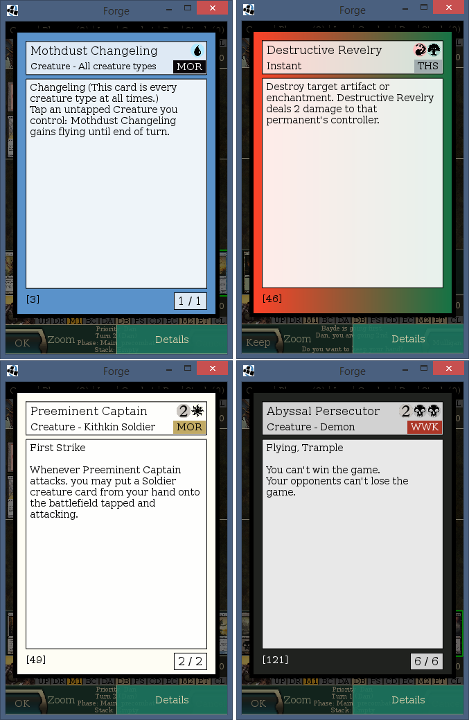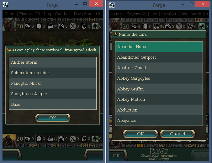Yes, the dialog can be dragged anywhere from the title bar, including off screen. When you release your finger it will always come back onscreen enough to move it again.squee1968 wrote:IMHO, I'd like to be able to see more card names on that list. I'd suggest making the panel full screen or nearly full screen with the prompt panel still visible, removing all the empty space between the card names, maybe even reducing the font size. Maybe a sliding scale based on screen size or resolution? Will the box be movable so that you can see the cards on the battlefield behind it?