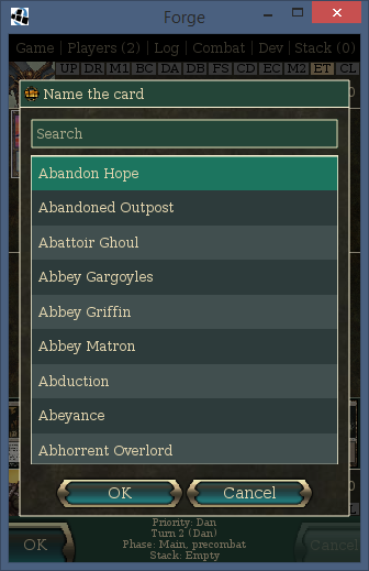 Here's an idea of what this looks like for the Add to Hand picker from the Dev menu, which lists all 13000+ cards in Forge and would be difficult to scroll through without searching capabilities: