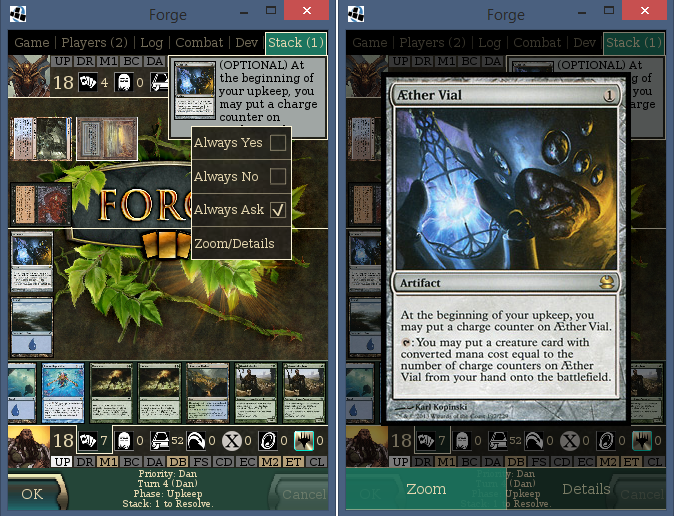 It would still be on the stack in most circumstances, unless it's a static effect (Alloy Golem, Caged Sun, etc). Mostly, I want to make sure there's a way to view the (full) host card simultaneously with choosing things that card wants chosen. As I mentioned, we the cheat the way we do it now for Desktop Forge, so it would be good if there was a way to streamline the process in the mobile mode. Temporarily hiding the dialog to see the host card would certainly be an acceptable solution.drdev wrote:Question though, won't the effect that opens the dialog still be present on the stack while the dialog is open? If that's the case, it'd be pretty simple to move the dialog out of the way and see the stack effect, which should show the thumbnail of the card and the effect you're picking a card for. In fact, for the mobile game, about half of the top stack item should automatically be visible behind the dialog at the maximum size.