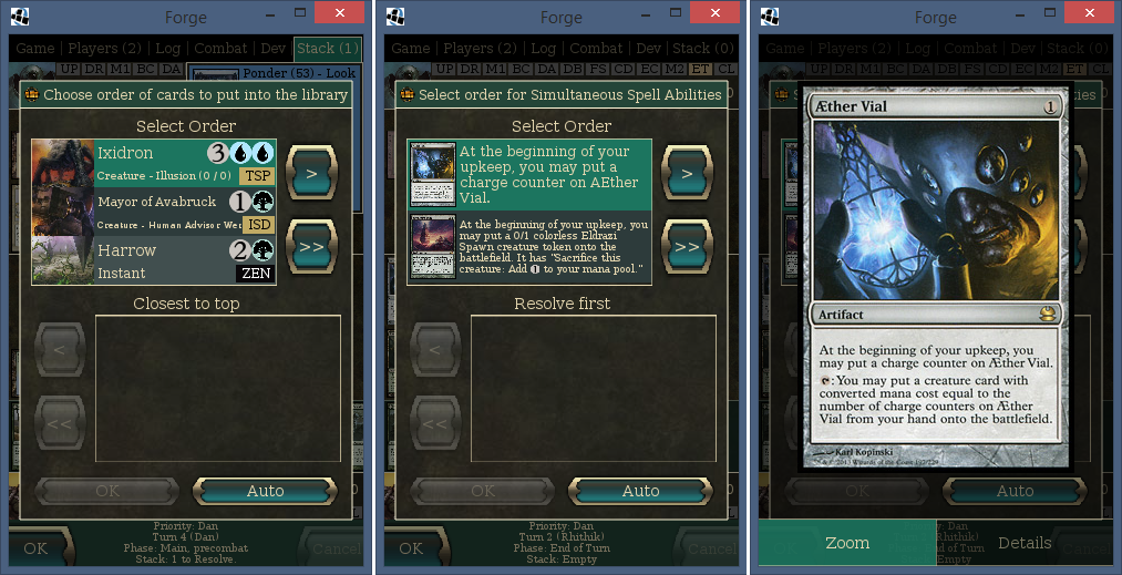 It would still be on the stack in most circumstances, unless it's a static effect (Alloy Golem, Caged Sun, etc). Mostly, I want to make sure there's a way to view the (full) host card simultaneously with choosing things that card wants chosen. As I mentioned, we the cheat the way we do it now for Desktop Forge, so it would be good if there was a way to streamline the process in the mobile mode. Temporarily hiding the dialog to see the host card would certainly be an acceptable solution.drdev wrote:Question though, won't the effect that opens the dialog still be present on the stack while the dialog is open? If that's the case, it'd be pretty simple to move the dialog out of the way and see the stack effect, which should show the thumbnail of the card and the effect you're picking a card for. In fact, for the mobile game, about half of the top stack item should automatically be visible behind the dialog at the maximum size.