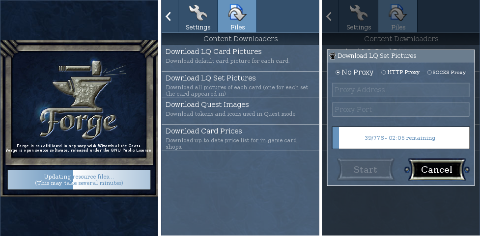 Thanks for reporting these workarounds. I added a Known Issues section to the first post so people know about them. I'll also definitely investigate and try to fix these problems so the workarounds aren't needed.SpiderBrigade wrote:Okay, I got this working on my Nexus 10. I spent a lot of time doublechecking the file structure but what actually solved it was switching my tablet to portrait view. After that forge loaded perfectly (although my high-res card images are not showing, that's the next project). If I set the tablet back to landscape, forge just goes to black screen after opening.I had this problem too, and was able to fix it: the default theme folder includes several files which the others do not - the image with the avatar tiles etc. I got firebloom theme to work by copying these additional files over. Presumably they aren't there since the app is supposed to fall back to the defaults, but that seems to not be working.Rosieodonell wrote:So if I click on the settings button I was able to change to journey theme. However when I select constructed it just freezes.