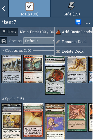 Also note that options to Add Basic Lands, Rename Deck, and Delete Deck are available in a menu that opens when you tap the "..." button next to the Save button.