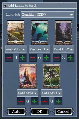 For draft and sealed, instead of having a couple hundred basic lands added to your sideboard automatically, you'll be able to manually add only the basic lands you want. In addition, the dialog has an Auto button which will automatically calculate the optimum number of each basic you should add based on the color breakdown of your deck's non-land cards and the colors provided by lands and other mana producers already in the deck. I'm probably going to disable this Auto button for 1.5.20.002 so I can get the release out sooner, but that's one of the next things I'm going to add.