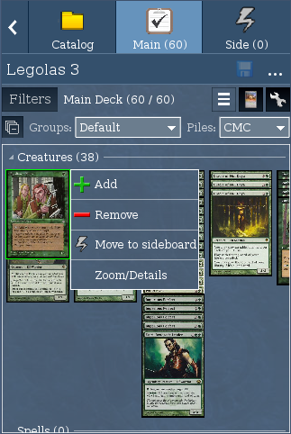 • Deck editor now provides context menus for moving cards between the catalog/draft pack, the main deck, and the sideboard. These menus appear on single tap so you don't need to double tap anymore (though that still works as it did before). This includes the option to add a card straight to you sideboard while drafting.