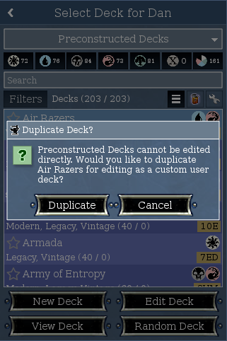 - Allow duplicating preconstructed and quest opponent decks as custom user decks, allowing for tweaking them to your liking