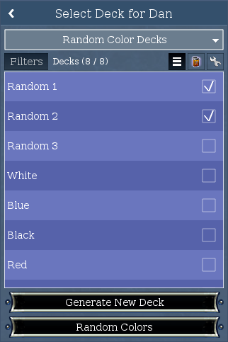In addition to adding support for duplicating preconstructed and quest opponent decks, I've gone ahead and added support for generating new decks from a random theme or random colors using a new "Generate New Deck" button under those lists. It uses the selected colors or selected theme to generate the decklist, then opens the generated deck in the editor, where you can name it, tweak it, and save it.