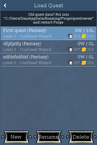 As you can see, I've split the load and new Quest sections into separate screens, and rearranged things slightly for this more vertical screen. As part of this, I eliminated the radio buttons for difficulty, instead favoring another combo box.