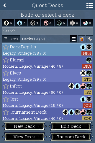 I've made some progress today on Quest deck editing. Here's what the Quest Decks screen looks like: