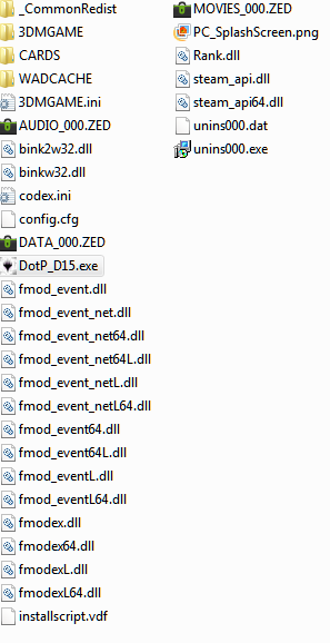 You forgot a directory: CARDS must be put inside another directory called Content. You are also missing the file that sumomole added back in this topic, 3DM_CEG.dll.damienx45 wrote:first off i don't know what you guys are talking about i have looked for all those folders/files and can't find them:this is all i have thats in the game directory.