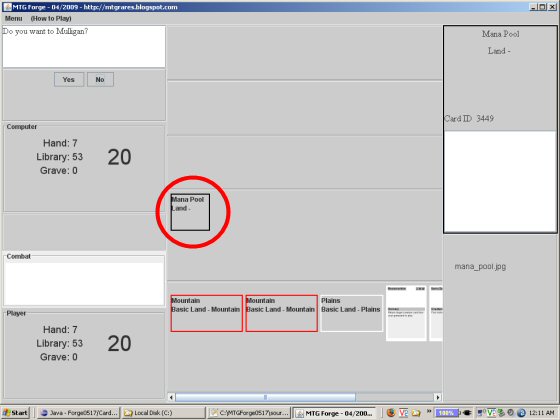 I realize this is an issue. My next step is to dig around to figure out how MTGForge knows where to put any given card object. Once I know that, then I can put it in its own panel off the battlefield. My goal in the screenshot was to figure out how to create a card on the fly (without it being part of an ability) and if the PlayerZone.add(card) method figured out how to treat it without any other intervention. Somewhere in the code it sees the type "Land" and puts it in the land row.after all it's not like the token should actually be anywhere but in play(pardon "on battlefield" Also, I would think that the mana pool would (optimally) be a separate(third under lands) UI area where you have "card pictures" of mana tokens on which you click to sacrifice them(while paying costs).