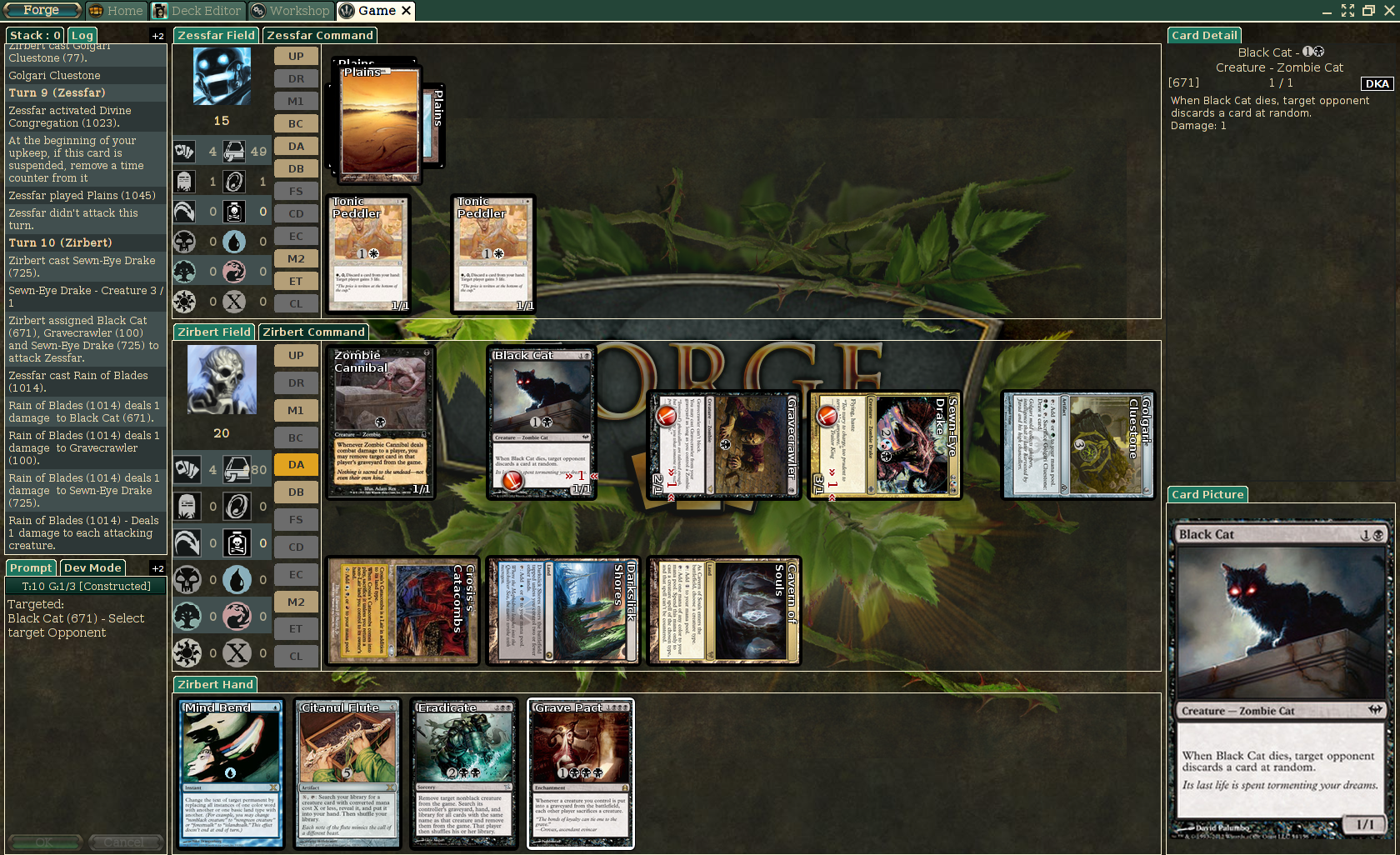 Description: The AI fired a Rain of Blades at my attackers, which included a Black Cat, and this happened. My Prompt window shows the Black Cat's ability waiting for target selection. The Rain of Blades is the last thing listed in the log. I'm attaching a screen capture of the board state.