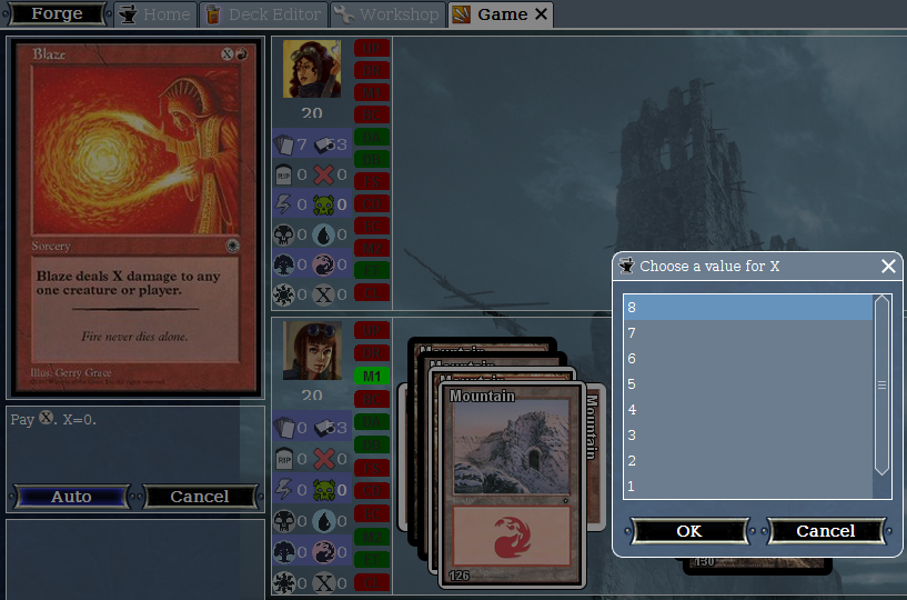 Well, technically the way it should work is that you choose the value of X during the announcement portion of paycosts. In some instances X isn't really "declared" it's "assigned"; For example, Spell Blast assigns X by the spell that's targeted. You don't really need to "declare X" of Spell Blast to be 4 so that Armageddon is a legal target.drdev wrote:If you press OK on that prompt, Forge will use AI logic to automatically pay whatever value for X you chose. This way, if you want to tap out for an X cost and have say 8 lands, instead of needing 8 clicks, you only need 2, one for Auto, and one for OK on the prompt. Even if you don't want to tap out, it only adds one extra click to choose a different value for the prompt.