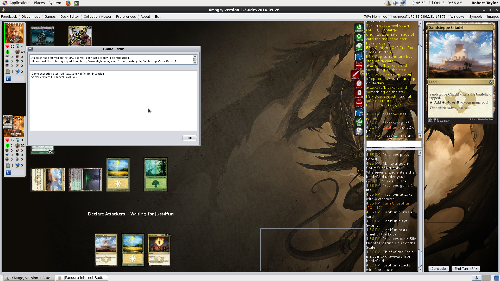 I'm not sure if this was just your game, as I was also playing a game at around the same time as you, and I got a nullpointerexception into stack overflow after my opponent cast High Tide. As of right now, no one can play any matches because the games they start don't show up on the match list, and half the people online have (disconnected) next to their name. I think the server just had a bug this morning.fireshoes wrote:My opponent attacked with Bloodsoaked Champion, then appeared to undo the attack. Then a NullPointerException occurred repeatedly until I got a stack overflow.