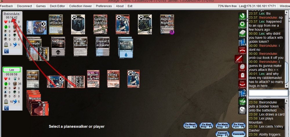He then passed his turn to me. I went to Battle Phase, get a token and both of my token had to attack (that's right, cause I got Rabblemaster). But here an error occurred too. My Goblin Rabblemaster was forced to attack by XMage. He didn't have to attack. I can choose if I want him to attack or not. But no chance. XMage forced him to attack.