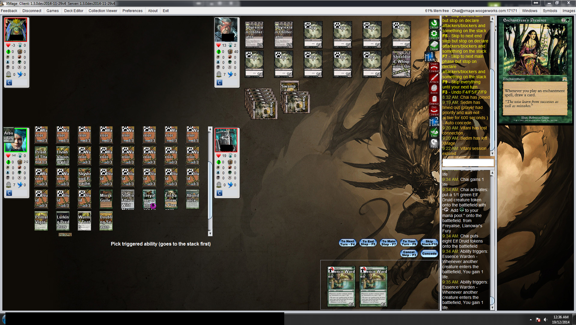 I have played a number of elf decks, and when they start getting large they either crash the server hosting the game or the game client itself. It often ends in a frozen game. Essence Warden Triggers (life gain in general really) normally are the culprit.