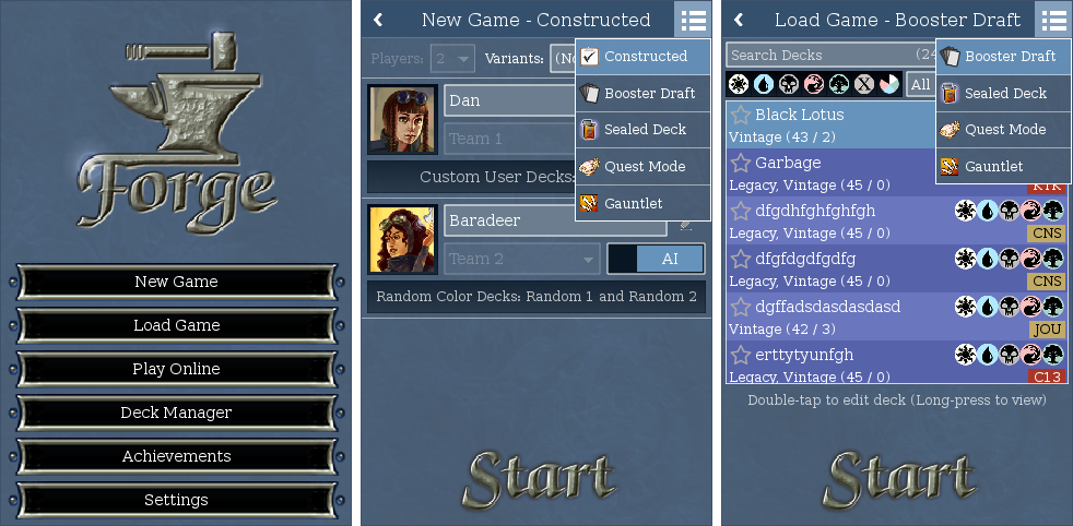 New Game will resemble the current Constructed screen, except with an additional drop down at the top to select the game mode. The game modes will be Constructed, Booster Draft, Sealed Deck, Quest Mode, and Gauntlet initially, with the ability to easily add others like Planar Conquest and Tournament later. The selected game mode will be remembered between sessions.