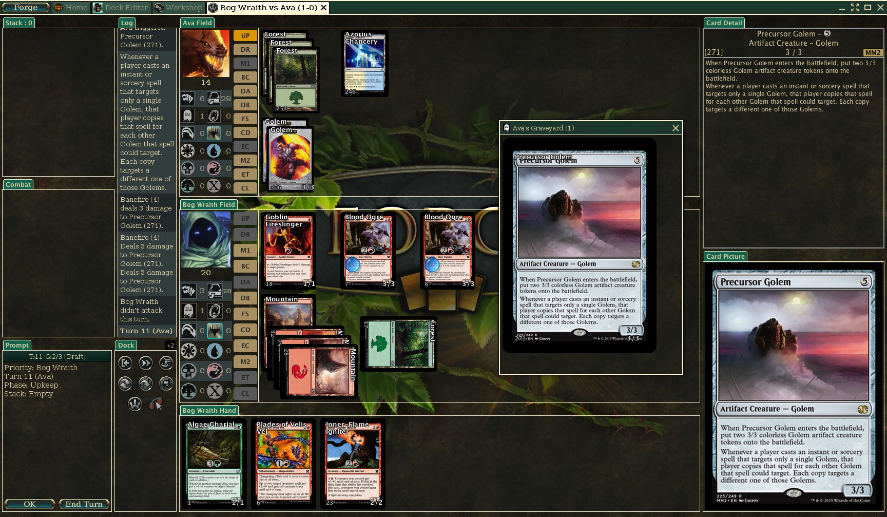 Cast a Banefire for 3x at a Precursor Golem destroying it. Both tokens should have gone with it but as you can see, the Precursor Golem is in the graveyard while the two tokens survive on the battlefield. I should have been able to attack with a clean board on my opponents side. It looks like the 3 damage was applied to the Precursor Golem which is id'd as #271, all 3 times instead of having the other 2 times being targeted at the tokens.