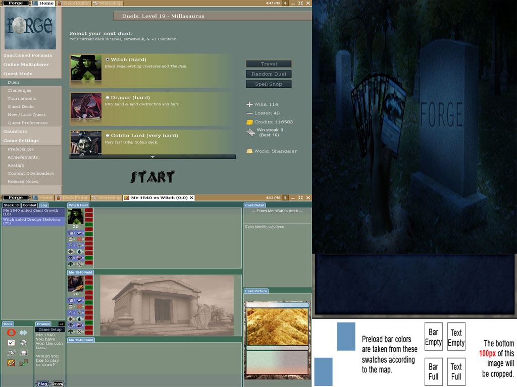 Here is a new cemetery themed skin. The splash screen shows a hand holding game cards and reaching up through the ground in front of a tombstone with Forge engraved on it. The eerie scene is lit by moonlight (it's a lot easier to see when the game is actually loading).