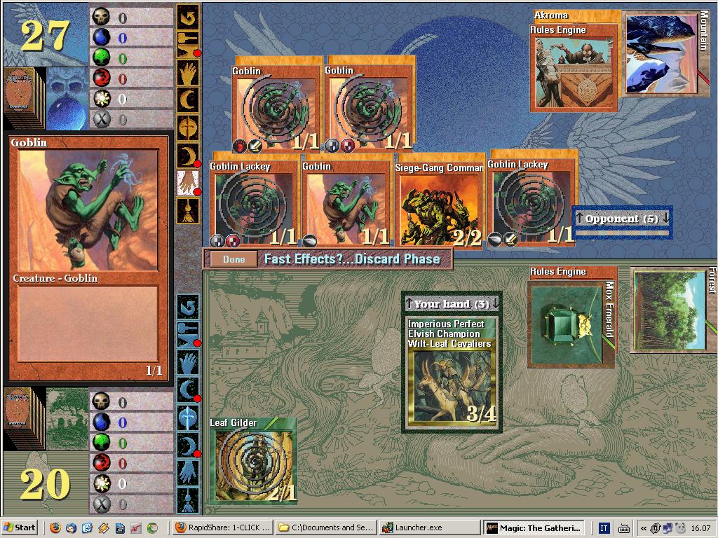 Edit: this is insane. I can't understand why some people says it's easy... This is my first round against Akroma today (I obviously lost, he sacrificed its normal goblins with Siege-Gang Commander to get right of everything I could play and with the flying Goblin Lackey it kept putting in other creatures...). What could I have done? It can spend 7 mana on the first round...