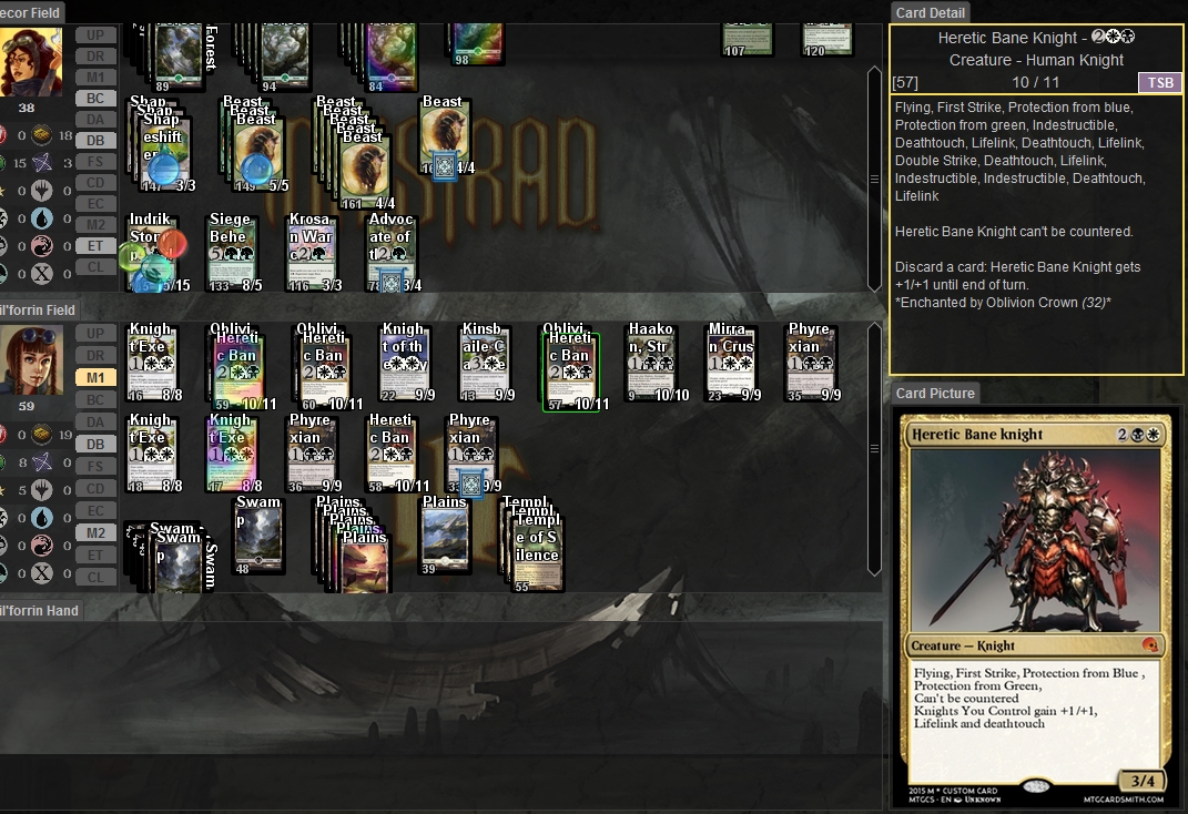 Its supposed to be a knight lord that grants lifelink and deathtouch, as well as +1/+1 while having pro green/blue and cant be countered along with first strike and flying His code ended up being :