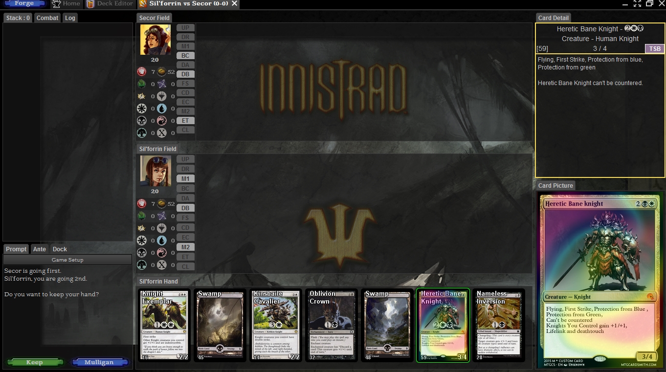 Its supposed to be a knight lord that grants lifelink and deathtouch, as well as +1/+1 while having pro green/blue and cant be countered along with first strike and flying His code ended up being :