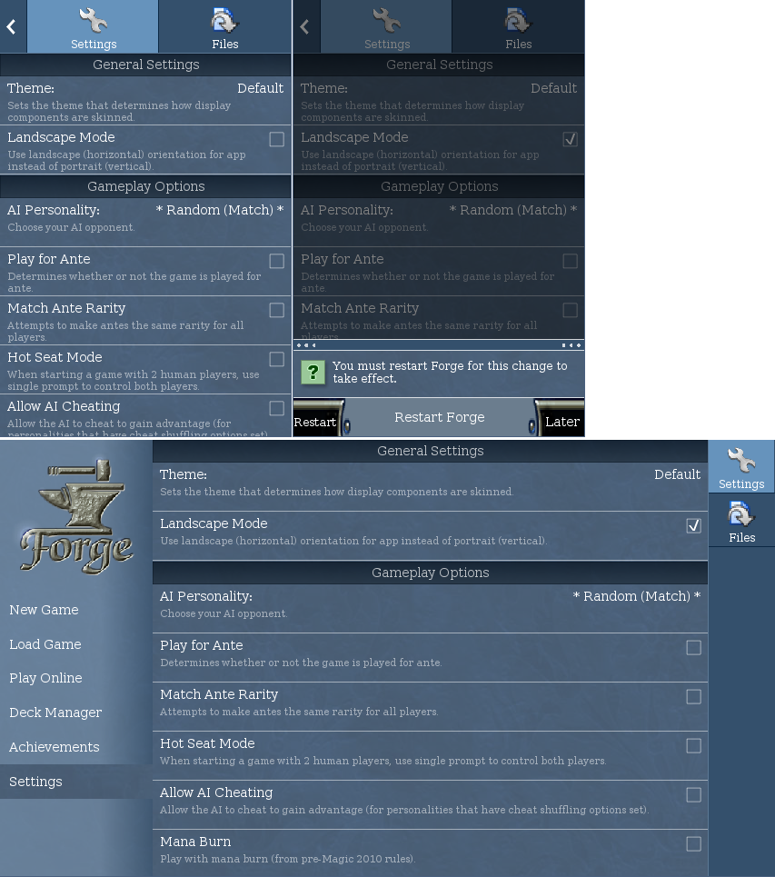 Just wanted to jump in for a moment and say thank you for creating an android port. I'm very happy with Forge in general and it's very nice to have it on my phones. There is of course room for improvement and I check the forums here quite frequently just to see how things are progressing. Even so, it's very playable as it is and it's a great piece of work. Thanks for the effort and I look forward to seeing it progress.