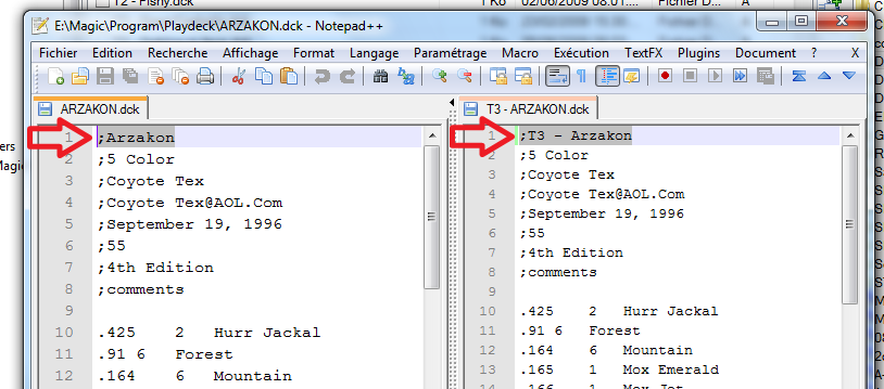 Open your deck file (for example ARZAKON.dck found in your Playdeck subfolder) with a text editor like Notepad. There, you must edit the first line of the file to add the prefix you choose for your deck (DON'T REMOVE THE STARTING ; SYMBOL, CHECK THE ATTACHMENTS TO BE SURE). Finally just save your edited file with the right name (go under File > Save as...).