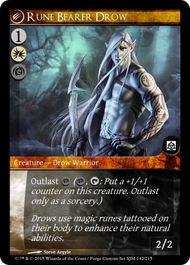 I always like drows, I want to introduce them as a new creature type. I choose white and black as their nature because the were once light beings, tempted by darkness. They will use Outlast as their main mechanic.