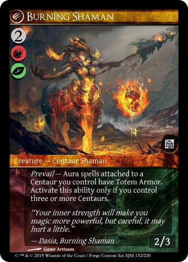 Burning Shaman: "Aura spells attached to a Centaur you control have Totem Armor. Activate this ability only if you control three or more Centaurs."edessa wrote:More cards. Your opinions are always apreciated.