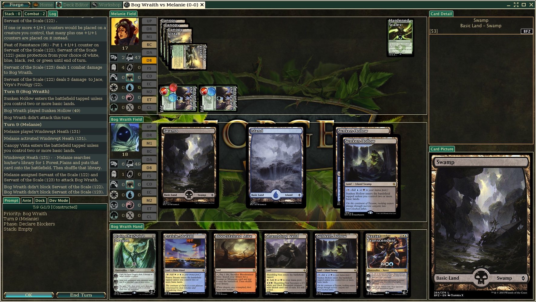 Bug occurred after combat when A.I. attacked. A.I. was playing with a G/W Hardened Scales deck that I have played against with other decks that had no similar crashes with . My deck was a first timer I was testing based on Reid Duke's Mage-Ring Esper deck which I include below: