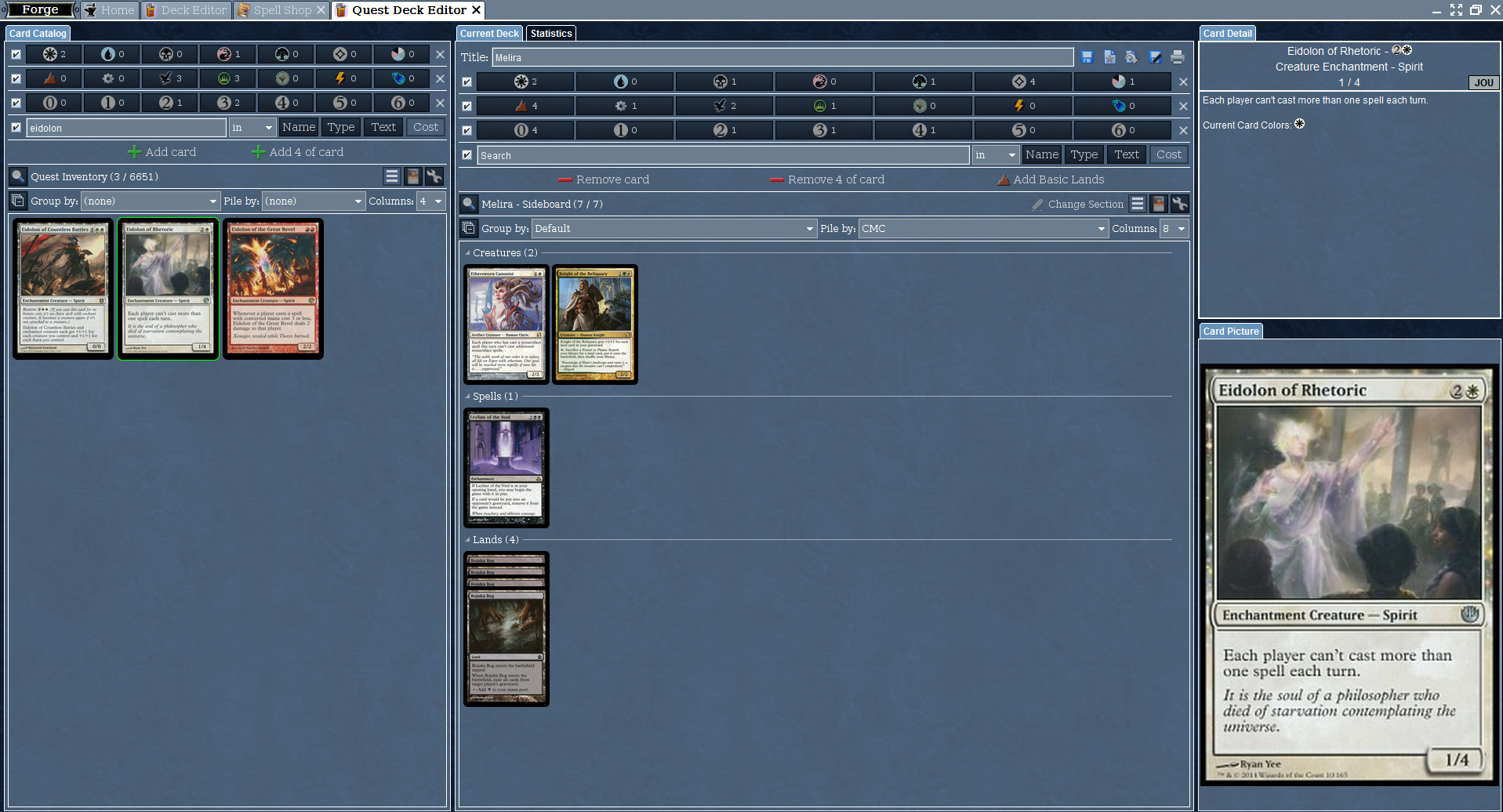 Description: Got the following error when trying to add Eidolon of Rhetoric to my sideboard. (I posted two errors in a row so I have to point out I closed and reopened in between errors). I had just finished a full Theros block draft and sold my extra theros cards in the shop. I changed to the draft decklist, then immediately changed to the regular quest deck editor selecting "no" when prompted to save my draft deck. I then did a search on eidolon and tried to add Eidolon of Rhetoric to my sideboard, prompting this error.