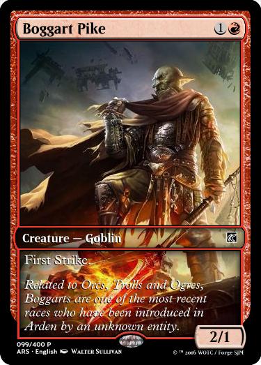 There will be 15 different races. Boar (previously presented as Quilboar in a previous release, I decided to change them to a creature type already in Magic), Centaur, Goblin, Griffin, Humans (Rebels, Barbarians, Nomads), Hyena (Gnoll previously, as quilboars I change them), Kavu, Minotaur, Ogre, Orc, Rat, Rhino and Wolf. The number of cards for each type will be different trying to express the minority on numbers some species have.