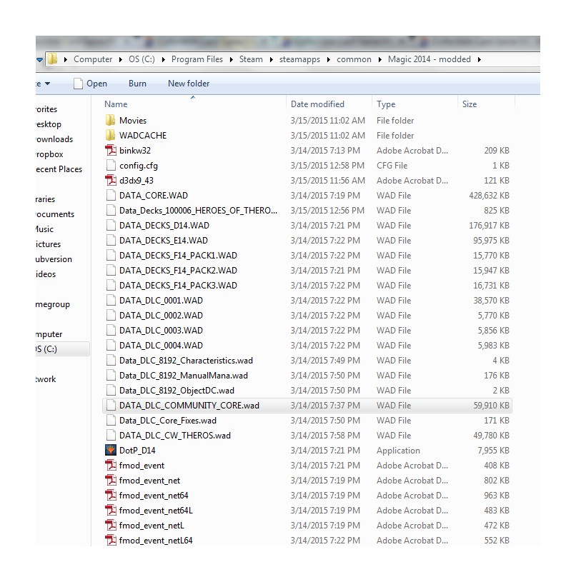 So I recently installed dotp 2014 via steam. I, then, downloaded a bunch of mods of Xander's community wad topic, copied my magic folder and dumped them all in the copy. I downloaded all the RSN stuff and try to play the game. I don't see the mod decks. I then learn that I need to add d3dx9_43 to the folder in order to use the mods. I download it and add it to my folder. I then try to play the game, but I still can't find the modded decks. Is there something I'm missing?