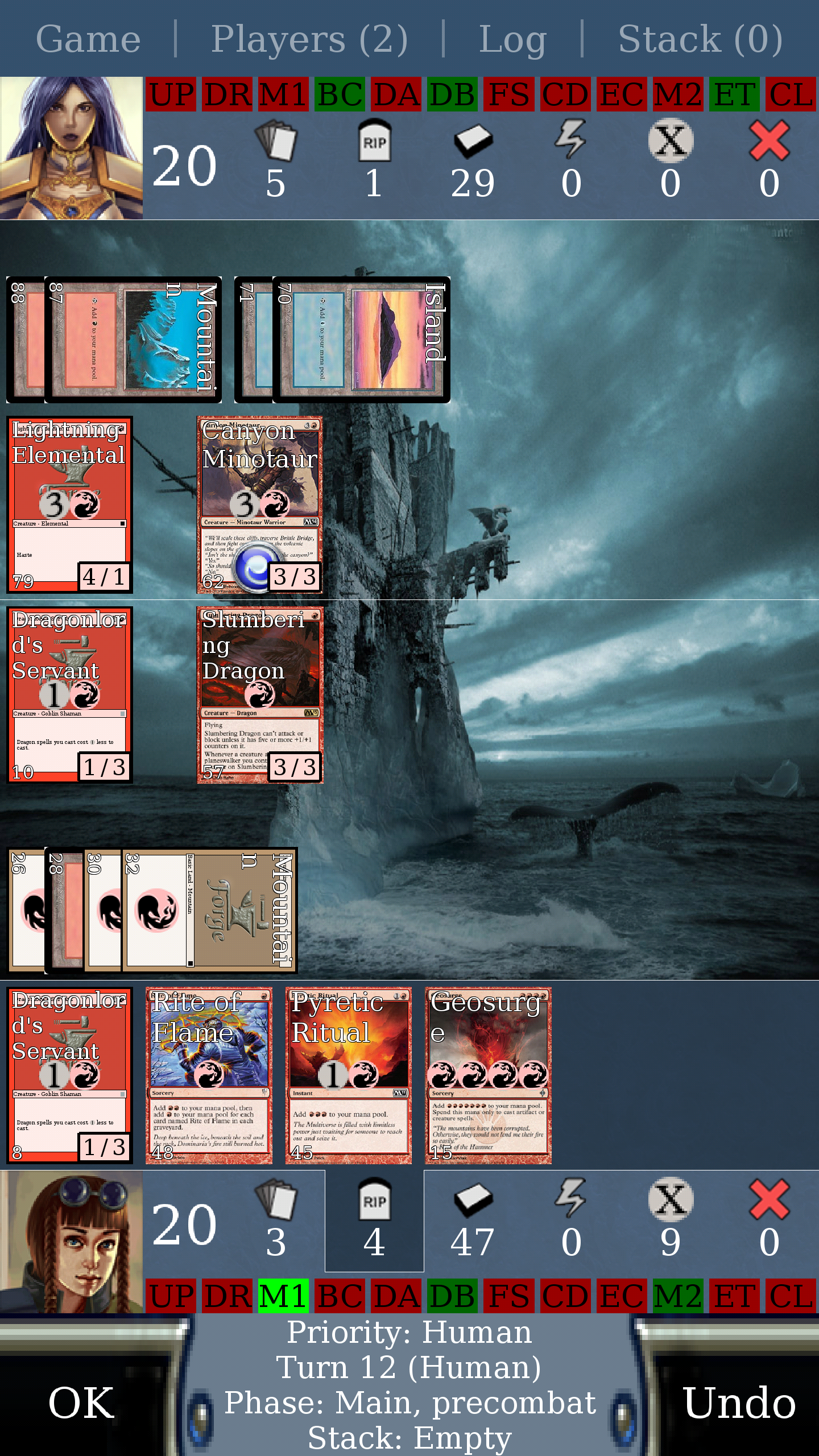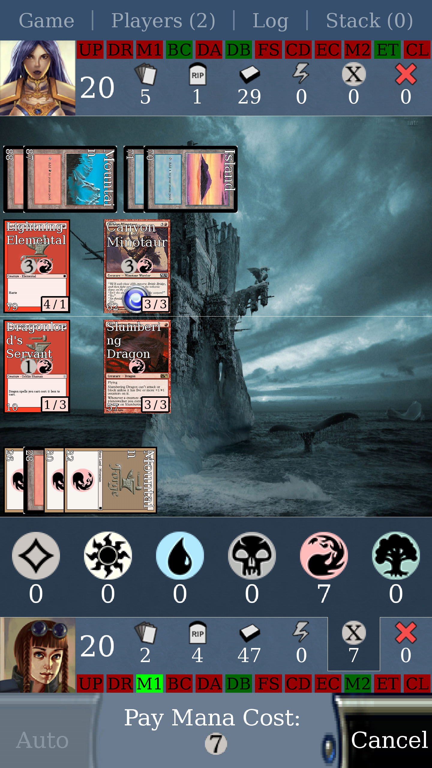 Ah I guess I missed if you said you were on Android, which is probably why I was confused. DrDev handles the interface for that if you want to repost over here so he'll be more likely to see it --ShampooBracelets wrote:Sure thing. I've got a picture of the boardstate, a picture of my graveyard to show you what spells I casted that turn, and a picture of my manapool being stuck on 7 after selecting dragonstorm.