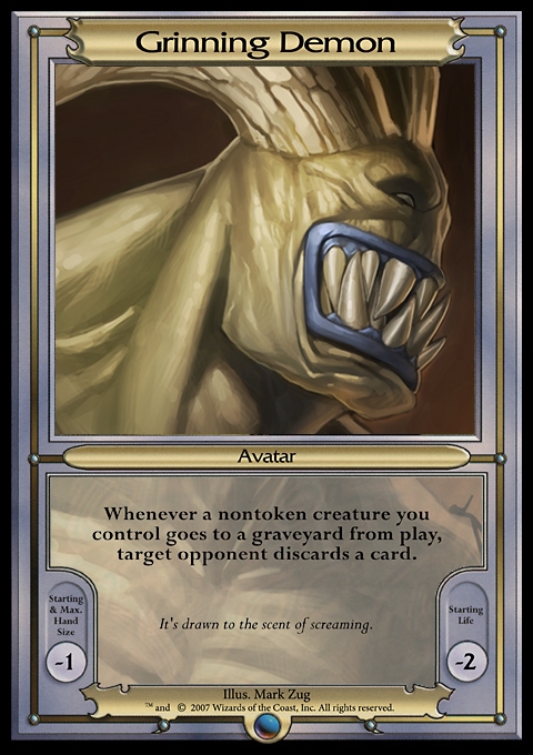 • Cards that reference themselves by name will do so with Avatar added after the name so as not to confuse with the real card they are based on.