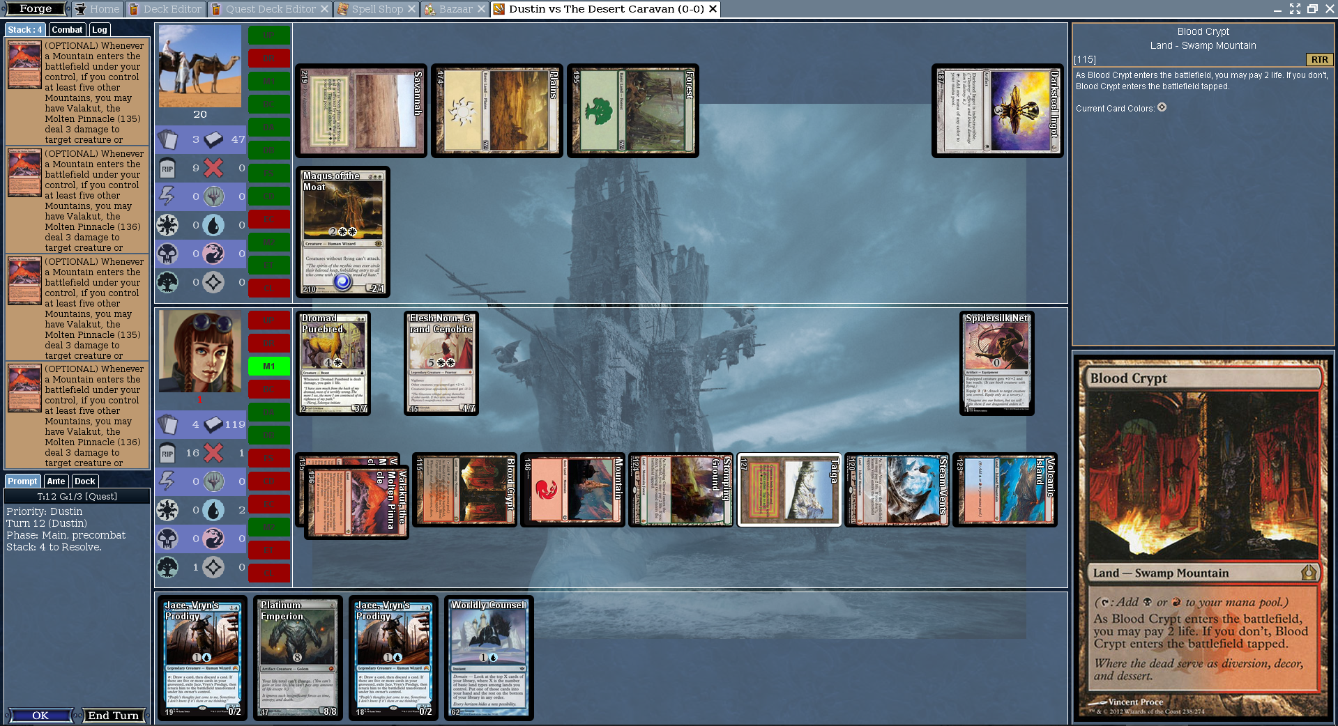 Hmm, can you please provide a definitive battlefield position where this happened? (if possible, please also attach a screenshot). I tried a couple things, including the situation you described (Goblin Chirurgeon is the only creature that can block and the only Goblin on the battlefield) but couldn't reproduce it yet. :/Nekoatl wrote:The AI sometimes activates the ability of Goblin Chirurgeon without sacrificing a Goblin. This seems to happen most consistently when Goblin Chirurgeon is the only creature that can block and the only Goblin on the battlefield.