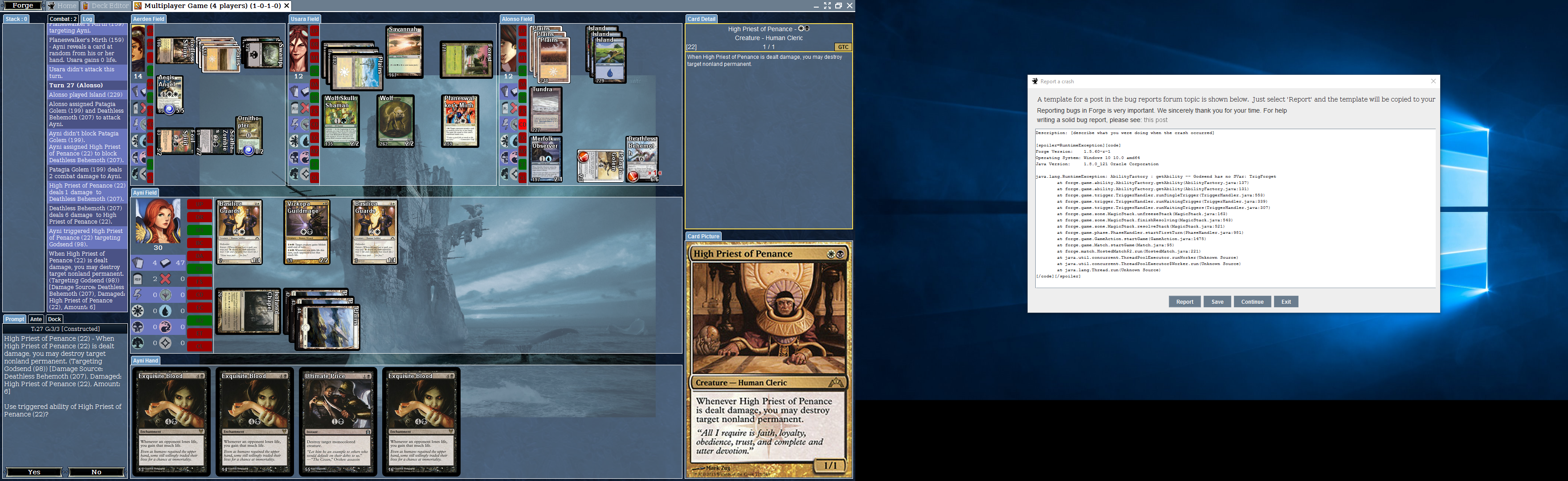 Description: Game crashed during a multiplayer game against AI (4-way FFA). Bot A attacked me with Deathless Behemoth, which I blocked with High Priest of Penance. After High Priest of Penance died, I got to choose a non-land permanent to destroy, which I targeted Godsend controlled by Bot B that was equipped to a Foul Spirit (which was made indestructible by Aegis Angel). I don't believe Godsend had exiled any creatures at this point. The crash occurred when I confirmed (click yes to) the triggered ability of High Priest of Penance.