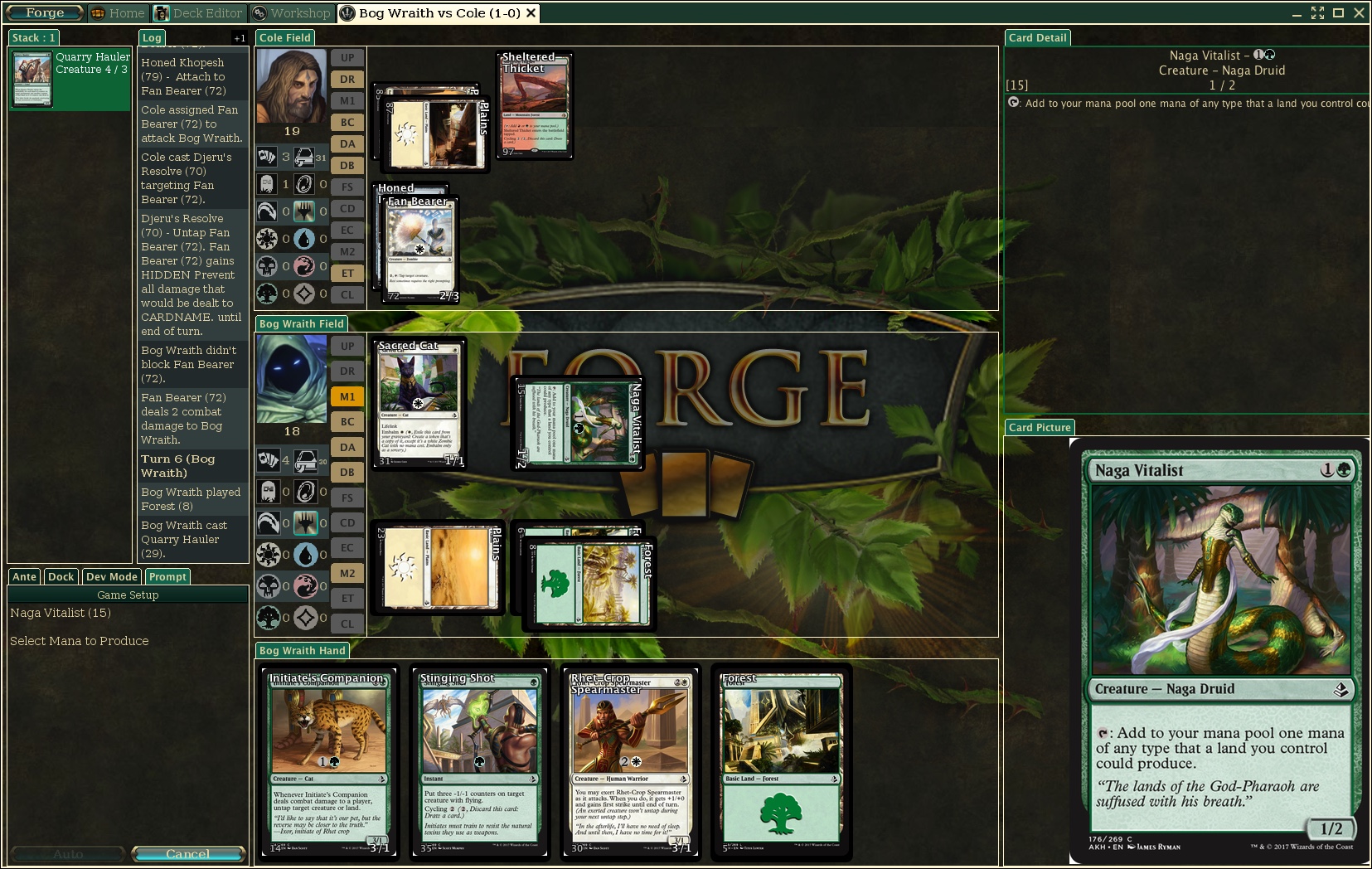After tapping Naga Vitalist for mana, Forge came to a complete stop. There was no crash so no report was generated. The cancel button did not work and there was no way to continue the game. I dumped the game state and include the file below along with a screenshot of the board/game state.